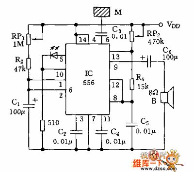 IC1 adopts time base circuit 555, the low frequency multivibrator is made of IC1 and R2, R3, R4, the oscillation frequency is fc=1.44/(R2+2R3)C3.