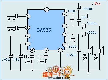 BA536 is a dual-channel power amplifier circuit, which characterizes good balance and little gain difference, the circuit is in 12-pin DIP in-line package, the features of the circuits are as follows. The output powers of each channel are 4.5w(when the loading impedance is 4Ω and the voltage of the power supply is 12v ) and 5.5W(when the loading impedance is 3Ω and the voltage of the power supply is 12v ). The wave rejection rate is 55dB, the distortion is THD=1.5% (when Po=0.5W), the crosstalk is lower than 57dB, the working voltage is 5-12v, which can compose a BTL easily. The limit parameter: Vcc=18V, power consumption: working temperature: -20-75℃.