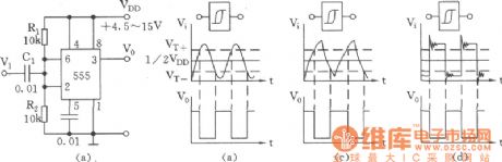 Schmitt trigger which is used in waveform transformation has extensive uses. Figure (a) shows the basic trigger circuit composed of 555. Figure (b),(c),(d) show the converting and transformation of different input signals and waveforms. (View)