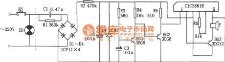 The music-type fridge door-close reminding circuit is as shown. This circuit is composed of the rectifier voltage regulator circuit, delay circuit, music IC CIC2851E and the speaker.etc. The reduce-rectify voltage circuit supplies the 3V power to the whole circuit.