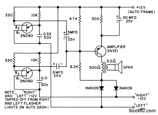 Produces two different tones in synchronism with turn-signal flashers. Diodes prevent short-circuit. For autos with positive ground. - Transistor Manual, Seventh Edition, General Electric Co., 1964, p 381.