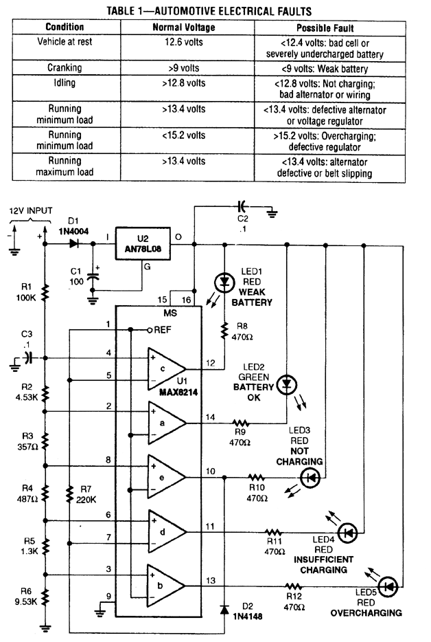 The automotive electrical diagnostic system is built around a Maxim MAX8214ACPE five-stage voltage comparator, which contains a built-in 1.25-volt precision reference, and on-board logic that allows the outputs of two of the comparators to be inverted.