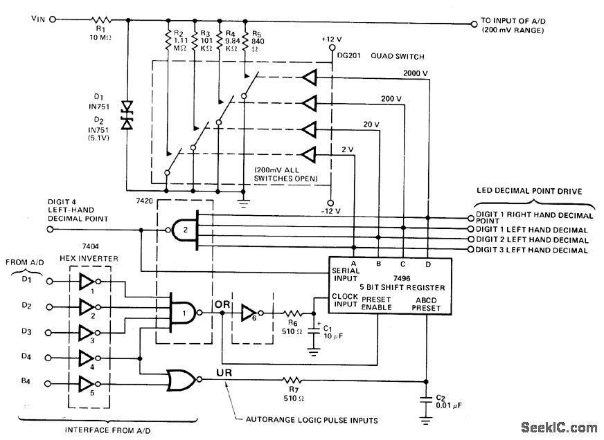 Digitally controlled attenuator uses DG201 quad analog switch as input ladder attenuator switches for A/D converter. Switches are controlled by digital logic that detects overrange and underrange information from A/D converter and closes appropriate attenuator path. Circuit is suitable for Siliconix LD110/111 or LD111/114 A/D converter,— Analog Switches and Their Applications, Siliconix、Santa Clara、CA、1976, p 6-28.