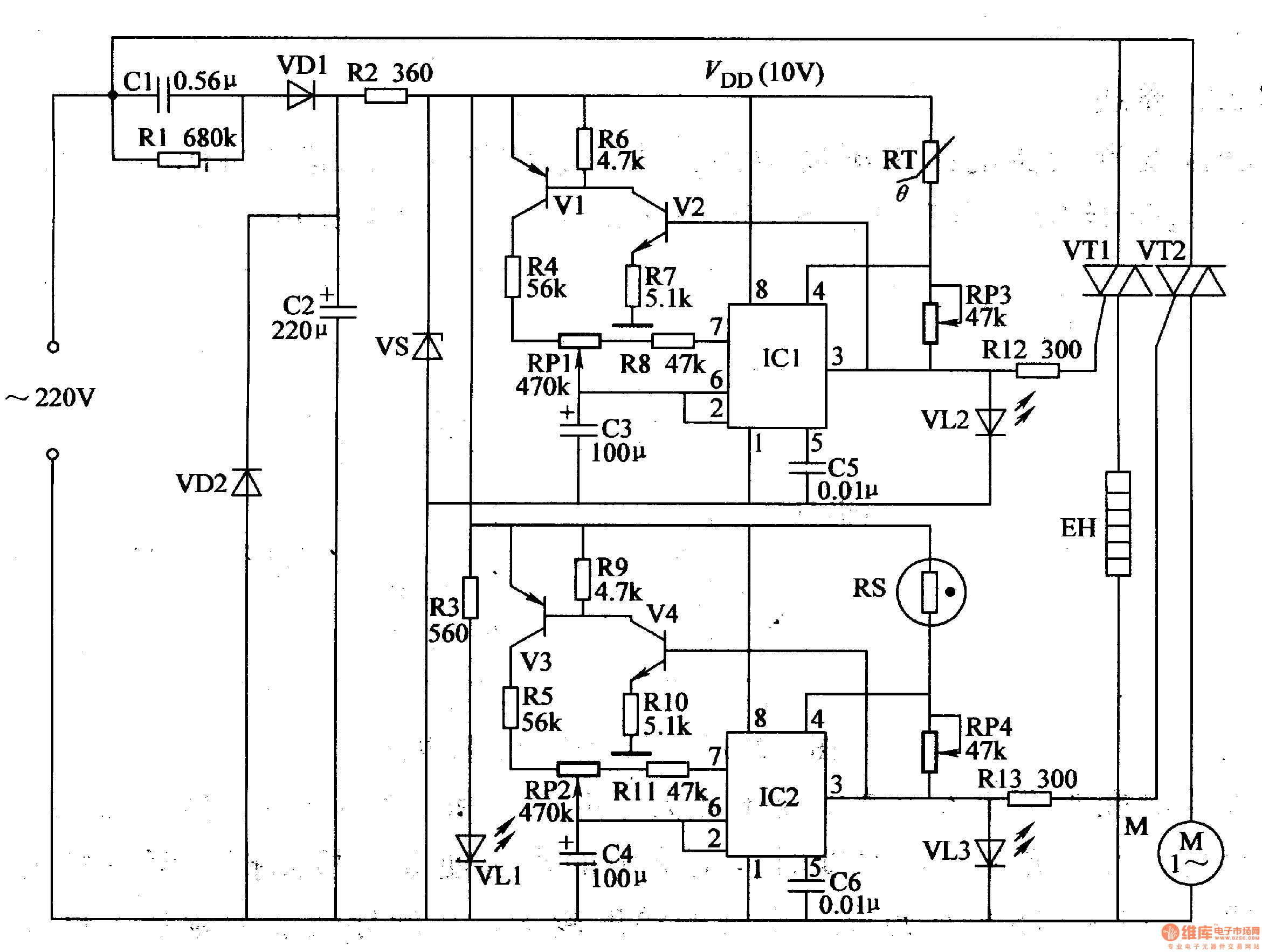 After the drying case begin to work, RS’s resistance value becomes smaller, and IC2’s 4 pin’s voltage becomes higher, making the oscillator begin to work. IC2’s 3 pin outputs high level, illuminating VL3, and M begins to drive the steam out of the case. When C4’s voltage reaches 6.7V, 3 pin outputs low level and M stops working. Then C4’s voltage becomes lower, illuminating VL3 again, and M begins to work. When the it is not too wet, IC’2 will stop working. When it is too wet, IC2 works again. So the circuit works like this until the product is dry and VL3 is not illuminated.