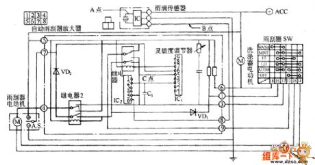 It is a automatical wiper control system circuit diagram, when the rain drops to sensor, its internal will produce voltage(A point) change which changes in relation to the rain intensity and frequency(in piezoelectric element, the voltage waveform is proportional to the rain drop energy), this voltage waveform is amplified by sensor internal amplifier circuit(B point), it is stored in power amplifier charge circuit. When the voltage singal of storing charge circuit reaches a definite value(V0), it is imported into wiper dirve circuit by comparing circuit, then the wiper starts to work.
