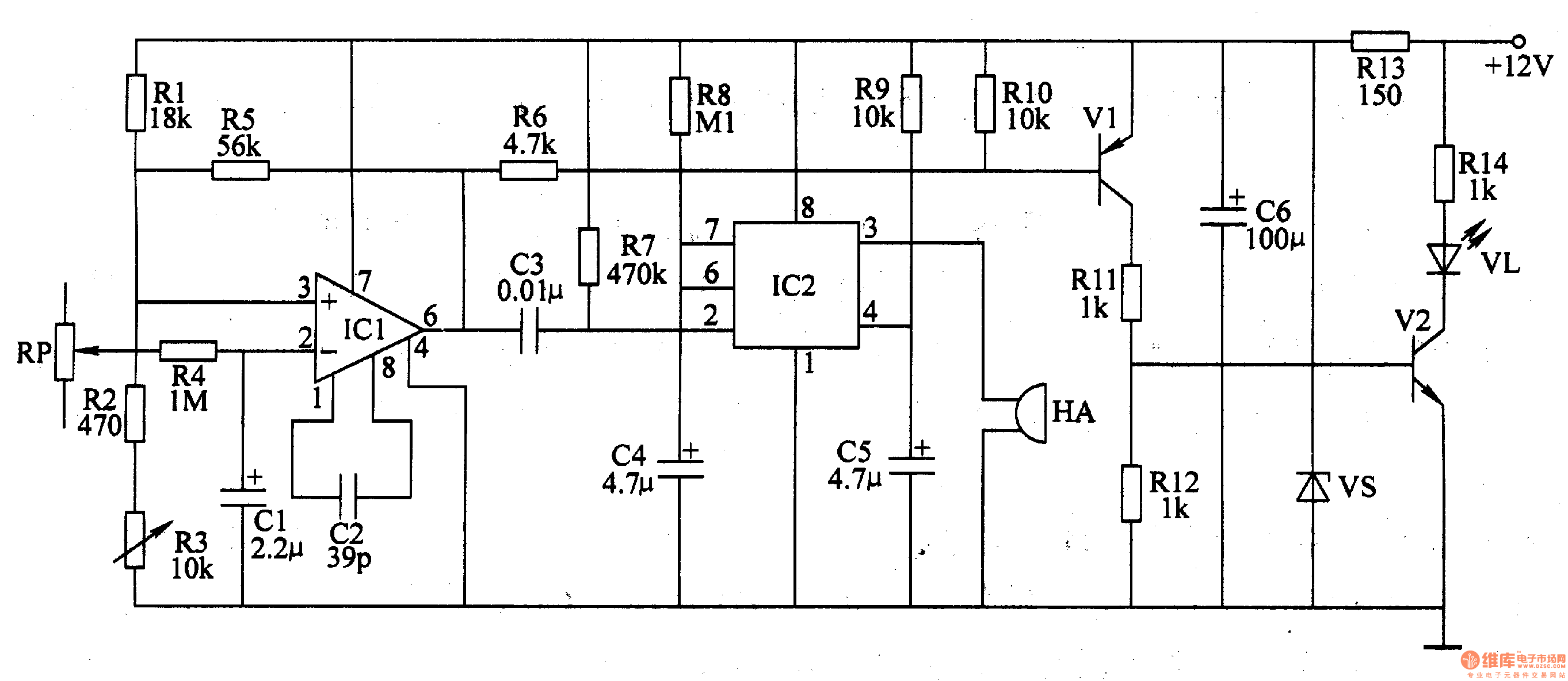 When the amount of fuel is below a certain value, pin 6 is at low level. And then V1 and V2 is on to light up LED VL; The monostable flip-flop inside IC2 flip, changing from steady-state into transient-state. Pin 3 of IC3 is at high level,and the beeper HA works.