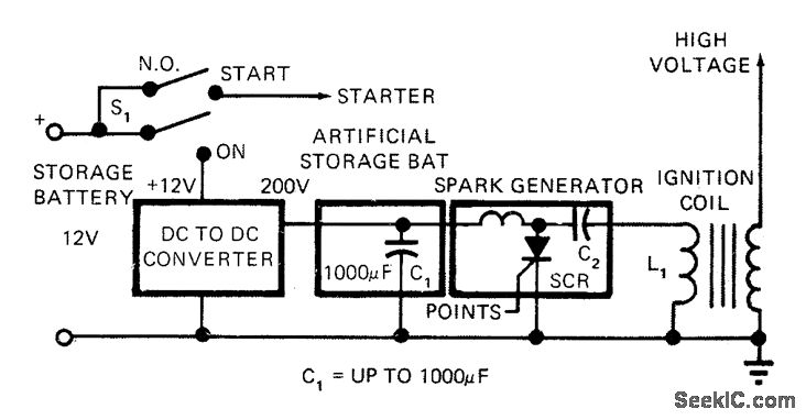 Developed for use with capacitor-discharge ignition systems to provide independent voltage sourcefor ignition when starting car in very cold weather. Before attempting to start car, S1 is set to ON position for energizing DC-to-DC converter for charging C1 with DC voltage between 200 and 400 V. Starter is now engaged. If voltage of storage battery drops as starter slowly turns engine over, C1 still represents equivalent of fully charged 12-V storage battery that is ca pable of driving ignition system for almost a minute.-W. Stalzer, Capacitor Provides Artificial Battery for Ignition Systems, EDN Mage-zine, Nov. 15, 1972, p 48.