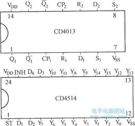 CD4514 is a four-sixteen line decoder.CD4013 is a bistable circuits.