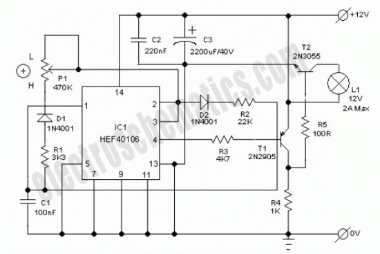 Ultra simple car interior light dimmer circuit of a pulse width modulated (PWM) energy saving dc lamp dimmer is described here. With the help of this circuit, you can control the intensity of the dome lamp in your car from near 5% to 90% using a single potentiometer. The circuit is designed for cars with negative ground.The circuit works off 12V dc supply from the car battery and is capable of driving dc incandescent lamps of wattages up to 24W!The design is based on IC1 (40106) astable multivibrator whose output is low for a period determined by R2 and high for a period determined by R1 and P1. Output from IC1 (at pin4) is applied to the base of transistor T1.Transistors (T1&T2) are switched on and the lamp is energized during the negative period of the output pulse of IC1. When the resistance of P1 is at maximum, the brightness of the lamp is at minimum level.