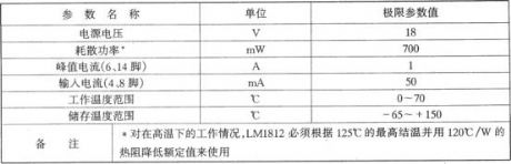 e. There is protection circuit inside the device. f. Detector output can drive 1A peak current. g. The range in the water is more than 30m. It is more than 6m in the air. h. Transmit power is up to 12w (peak). The following table shows the limit of LMl812 ultrasonic dedicated circuit operating parameters.