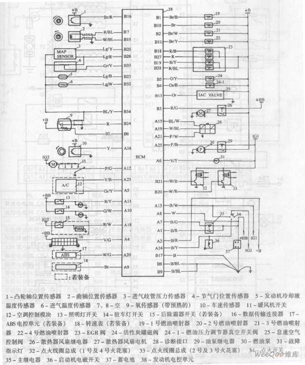 1. Camshaft position sensor 2. Crankshaft position sensor 3. Intake manifold pressure sensor 4. Throttle position sensor 5. Engine coolant temperature sensor 6. Intake air temperature sensor 7.8. Empty 9. Oxygen sensor 10. Speed sensor 11 . heater switch 12.Air conditioning control module 13.Light switch 14.In light switch 16.Data transmission connector 17.ABS electronic control unit 18. Tachometer 20.2 19.No1 fuel injector 20. No 2 fuel injectors fuel injectors 22.4 21.No.3 No. 24-valve fuel injectors 23.EGR. Canister magnetic valve 24-1. Fuel pressure regulator vacuum switch valve 25. idle air control valve 26. radiator fan relay 27. radiator fan motor 28. diagnostic interface 29. pump relay 30. fuel pump 31. fault indicator 32. ignition coil assembly 33. ignition ring assembly 34. ignition switch 35. main relay 36. starter solenoid switch 37. accumulator 38. Engine Electronic Control Unit