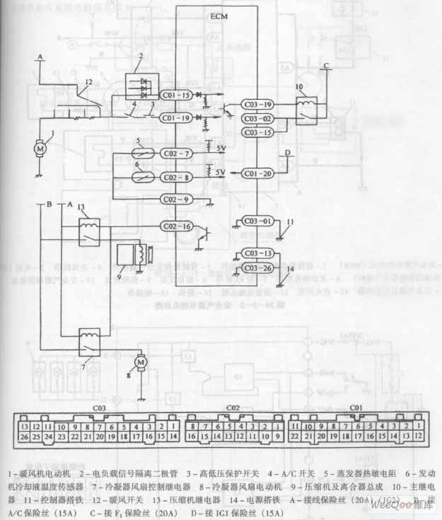 1. Heater motor 2. Electrical load signal isolation diode 3. High and low pressure protection switch 4.A / C switch 5. Evaporator thermistor 6. Engine coolant temperature sensor 7. Condenser fan control relay 8. Condenser the fan motor 9. Compressor and clutch assembly 10. Main relay 11. Controller Ground 12. Heater switch 13. Compressor relay 14. Power Ground A connects to fuse (20A) (IC2), B connects to A / C fuse (15A), C connects to F; fuse (20A), D connects to IG1 fuse (15A)