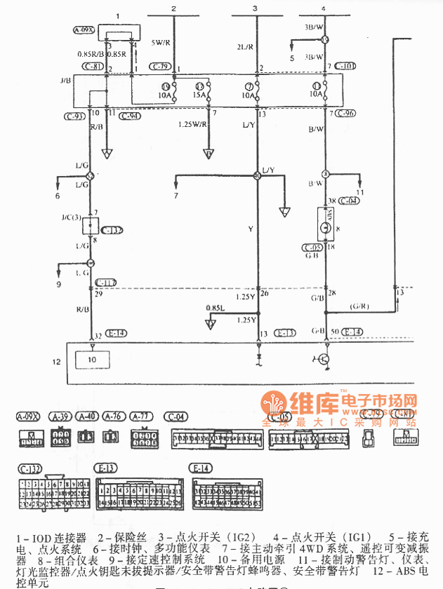 In the first picture the part 1 is IOD connector. The part 2 is fuse. The part 3 is ignition switch (IG2). The part 4 is ignition switch (IG1). The part 5 is connected to charging and ignition system. The part 6 is connected to the clock, multi-function meter. The part 7 is connected to active traction 4WD system and the remote-control variable shock absorber. The part 8 is instrument cluster. The part 9 is connected to the constant speed control system. The part 10 is standby power. The part 11 is connected to brake alarm lamp, meter, light monitor, ignition key not pulling reminder, seat belt alarm lamp. The part 12 is connected to the ABS ECU. And so on.