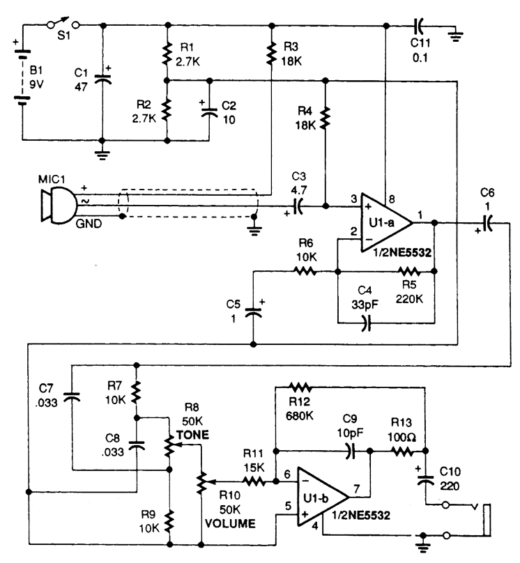 The heart of the Stethoscope is the NE5532 audio op amp, UI. That component directly drives low impedances and allows the use of headphones without adding another amplifier.
