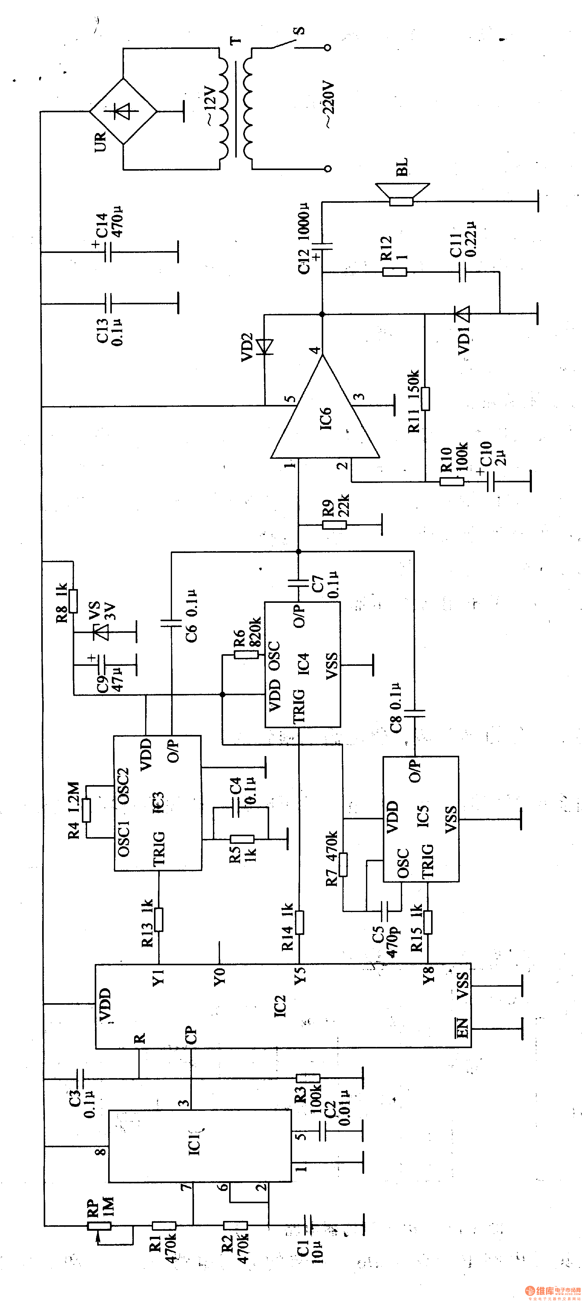 When the 8th pulse comes, Y8 outputs high level, and IC5 begins to work. O/P will output bark signals and BL will make a barking sound.