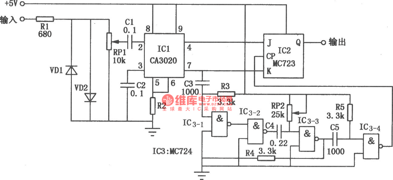 The circuit's main component uses digital integrated circuit which can be used in frequency range of 1-10kHz. Its identification precision is high so that it can detect small frequency shift as small as 1%. The picture shows the frequency shift modulator circuit. IC1 is wide frequency amplifier CA3020. It constitutes the circuit's input terminal whose differential output are put on IC2(JK trigger MC723)'s J,K input terminals. GATE circuit IC3 constitutes monostable multivibrator, and its timing cycle is equal to half period of central frequency. Its input signal will gate the trigger after it is time delayed by the monostable multivibrator.