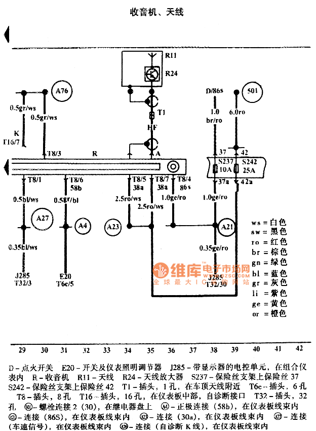 The third picture shows the radio and antenna. In the picture the part D is ignition switch. The E20 is switch and instrument lighting regulator. The J285 is an ECU with monitor inside the instrument cluster. The R is radio. The R11 is antenna. The R24 is antenna amplifier. The S237 is the fuse on the fuse holder 37. The S242 is the fuse on the fuse holder 42. The T1 is a plug with 1 hole near the car roof antenna. The T6c is plug with 6 holes. The T8 is plug with 8 holes. The T16 is plug at the middle of the dashboard with the self-diagnosis interface. The T32 is plug with 32 holes. And so on.