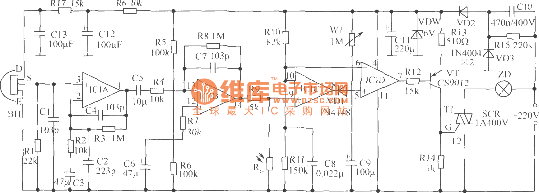 IC1 is four operational amplifiers LM324. Sensor BH is RS03. If you use some other types of sensors, it should have the right design of the amplifier gain support, but it must select two-component type.