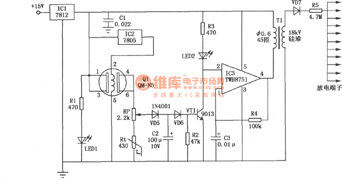 The discharge end made up from needle-shaped material adopts open type.In this way it can reach the goal of increasing the density of negative oxygen ion and reducing the density of ozone.When the atmosphere is normal inside,the potential of the gas sensor Q1's pin④ and pin⑥ is low.VT1 is stopped.The potential of IC3's pin② is high.The oscillator stops working.There's no negative oxygen generated.Rt is negative temperature coefficient thermistor.It compensates the errors causing by gas sensor Q1 as the temperature changes.The potential RP is used to adjust the sensitivity of detecting harmful gas.