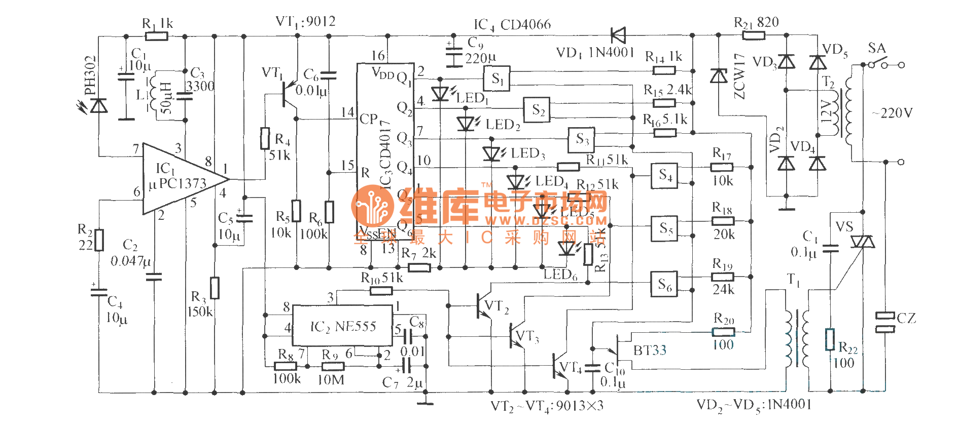 The circuit consists of infrared receiver demodulation circuit, speed control circuit, SCR phase trigger circuit and natural air control circuit.