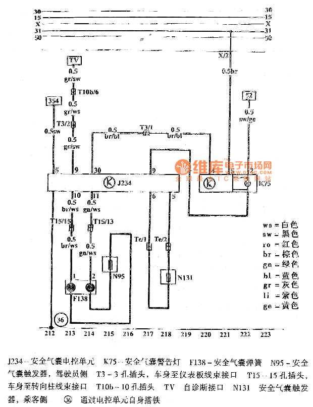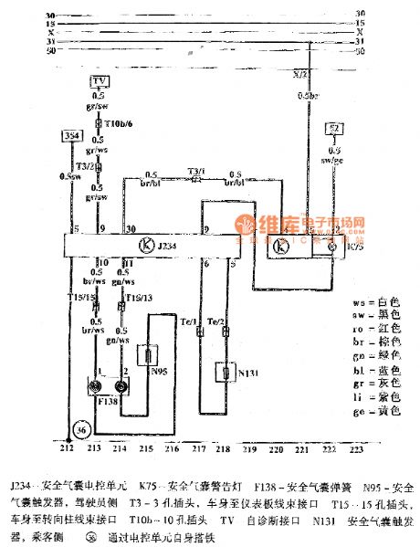 J234-AirbagECU K75-Airbag warning light F138-Airbag spring N95-Airbag Trigger, driver side T3-3 hole plug, The car body to the instrument panel wiring harness interface T15-15 hole plug, The car body to the steering column harness Interface T10b-10 hole plug TV-Self-diagnosis interface N131-Airbag Trigger, passenger side 36-Ground through theECU itself