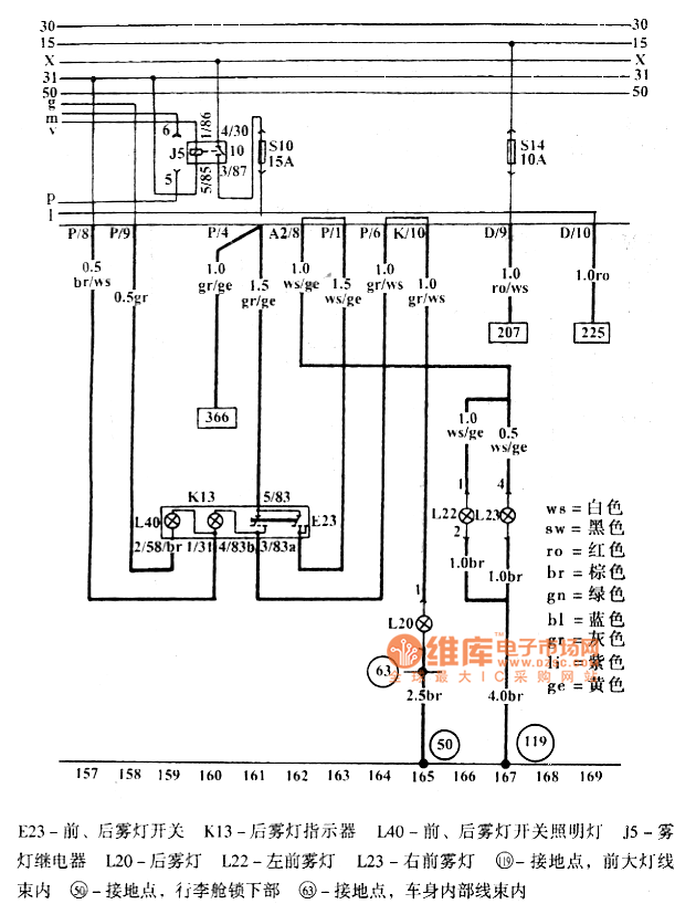 E23-Front and rear fog lamp switchK13-Rear fog lamp indicatorL40-Front, rear fog lamp switchJ5-Fog light relayL20-Rear fog lampL22-Left front fog lampL23-Right front lamp119-Ground point, Within the headlight wiring harness50-Ground point, in the lower part of the luggage compartment lock63-Ground point, in the car body internal wire harness