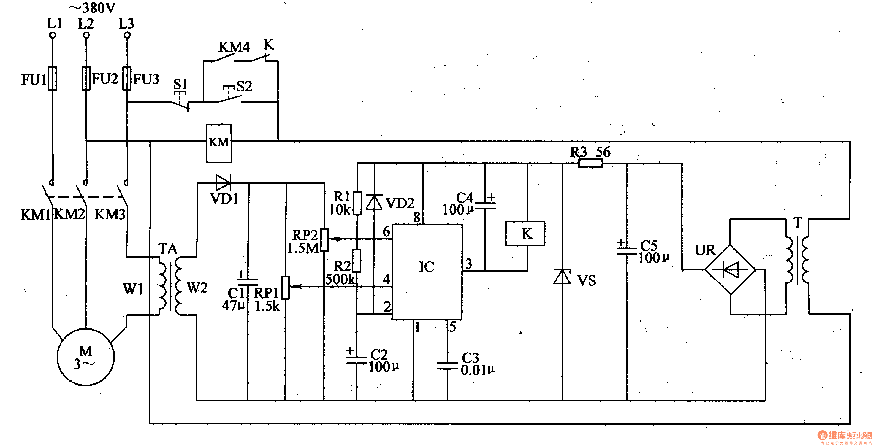 When the motor is overload, L1-L3 will have larger current. When the current reaches 1.2 times rated current, IC's 6 pin will have a voltage higher than 2Vcc/3. M will stop working.