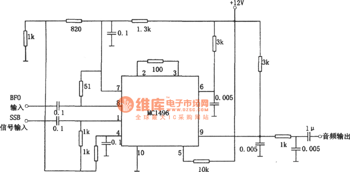 The picture shows the multiplying wave detector circuit. The circuit is single-side band AM signal detector. Its working principle is that it will multiply the received single-side band(SSB) signal by receiving end's restored carrier wave, and then the demodulation work will be done. In the figure, the manifold MC1496 is balanced modulator and demodulator. The circuit's output voltage is the product of input voltage signal and switching function provided by the carrier wave. The circuit has a sensitivity of 3 μV when it is operating in 9MHz IF frequency and the dynamic range is 90dB.