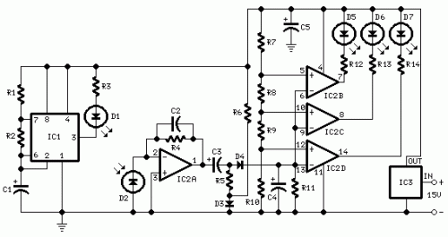Parts:R1 10K 1/4W ResistorR2,R5,R6,R9 1K 1/4W ResistorsR3 33R 1/4W ResistorR4,R11 1M 1/4W ResistorsR7 4K7 1/4W ResistorR8 1K5 1/4W ResistorR10,R12-R14 1K 1/4W ResistorsC1,C4 1µF 63V Electrolytic or Polyester CapacitorsC2 47pF 63V Ceramic CapacitorC3,C5 100µF 25V Electrolytic CapacitorsD1 Infra-red LEDD2 Infra-red Photo Diode (see Notes)D3,D4 1N4148 75V 150mA DiodesD5-7 LEDs (Any color and size)IC1 555 Timer ICIC2 LM324 Low Power Quad Op-ampIC3 7812 12V 1A Positive voltage regulator IC