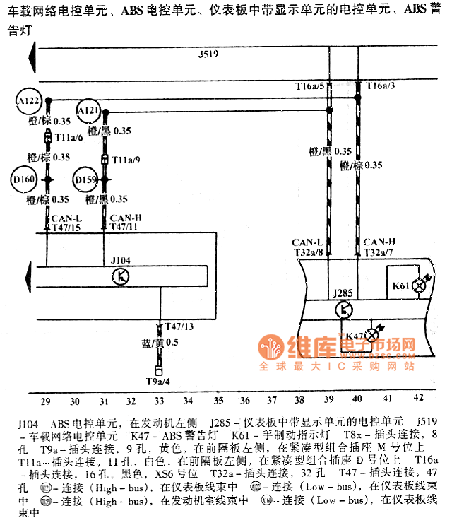The third picture shows the car network ECU, ABS ECU, dashboard ECU with display unit, ABS alarm lamp. In the picture the J104 is ABS ECU which is at the left side of engine. The J285 is dashboard ECU with display unit. The J519 is car network ECU. The K47 is ABS alarm lamp. The K61 is hand brake lamp. And so on.