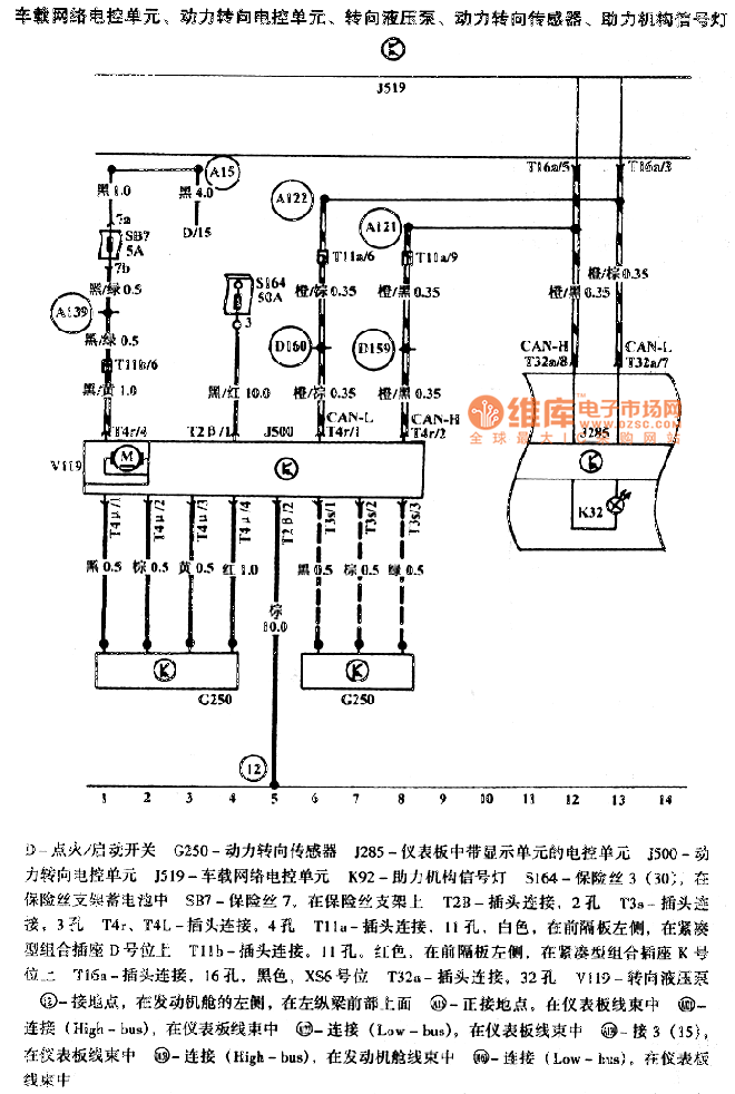 In this circuit the D is ignition/starting switch. The G250 is power steering sensor. The J285 is the dashboard ECU with monitor. The J500 is power steering ECU. The J519 is car network ECU. The K92 is assistance mechanism signal lamp. The S164 is fuse. The SB7 is fuse 7 on the fuse holder. The T2B is plug with 2 holes. The T3e is plug with 3 holes. The T4r, T4L are plugs with 4 holes. The T11a is plug with 11 holes. The T11b is plug with 11 holes. The T16a is plug with 16 holes. The T32a is plug with 32 holes. The V119 is steering hydraulic pump. And so on.