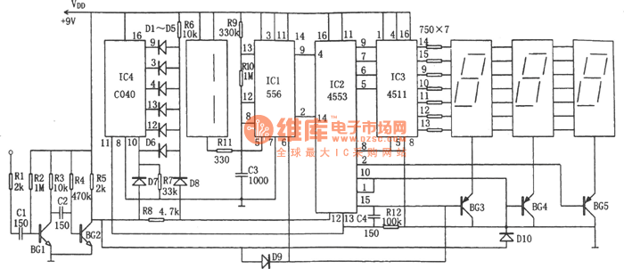 As shown in the circuit is a radio digital ondoscope circuit. It is composed of double time-base circuit 556( IC1), BCD code three bit counter IC2 (MC4553), 12 bit binary serial counter/frequency divider IC4 ( C040), BCD code seven segment lock /decode/driver and 4 digital luminescence tubes etc.