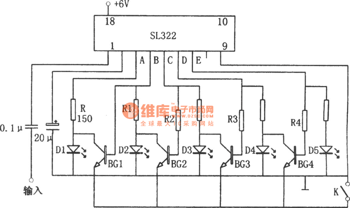 The picture shows the retractable dot display level indicator circuit. The circuit consists of luminescent display drive SL322, LED D1-D5, transistor BG1-BG5. When K is disconnected, the triodes are all connected to the ground. When the level becomes higher which makes the LED D2 illuminated, B's level becomes higher and BG1 is connected which will make the LED D1 off. When the level becomes higher which makes D3 illuminated, C's level becomes higher which makes BG2 connected, and D2 will be off. At this time, B's level doesn't change and BG1 remains disconnected. D1 is still not illuminated.