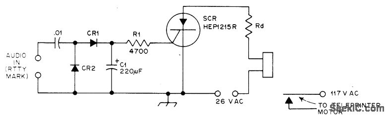 Single SCR can replace several transistor or tube stages in RTTY, VOX, COR, and other relay control circuits. Threshold triggering effect of SCR means triggering is automatically suppressed on low-level noise and similar interference. Used in RTTY autostart and motor delay sections of demodulator. Pickup time is 1 s and dropout time is 3 s, determined by values of R1 and C1 and by SCR, Circuit keys only on 2125-Hz mark tone. Diodes are 50-PlV silicon. Rd is appropriate dropping resistor for relay, if needed.-D, Weeden, SCR Relay Control for RTTY, VOX, and COR ,QSTT, July 1976, p 42.