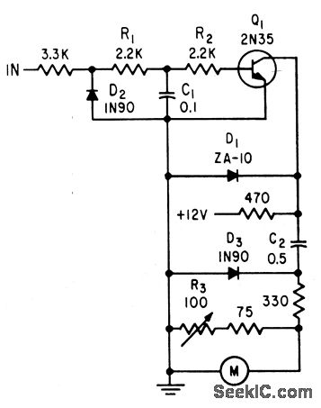 Uses zener diode to compensate for variations in 12-v supply. Meter is calibrated in rpm, using R3 for 0ncl adjustment. Range is 0 to 6,000 rpm. Input is ignition wave-form.-J. Cowan, Auto Tachometer Uses Transistor, Electronics, 31:33, p 92-94.