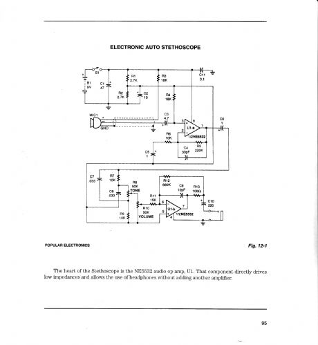 The heart of the Stethoscope is the NE5532 audio op amp, UI. That component directly drives low impedances and allows the use of headphones without adding another amplifier. (View)