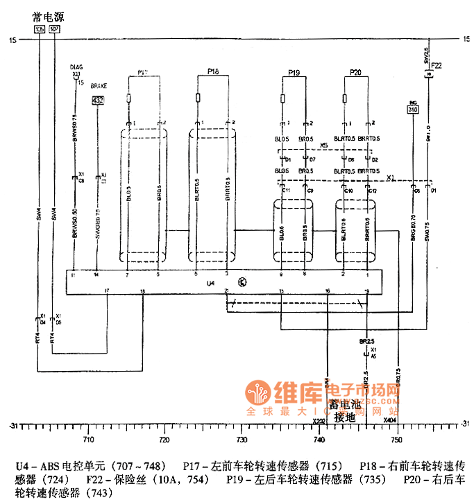 U4-ABS electronic control unit (707 ~ 748), P17-left front wheel speed sensor (715), P18-right front wheel speed sensor (724), F22-fuse (10A, 754), P19-left rear wheel speed sensor (735 ), P20-right rear wheel speed sensor (743).
