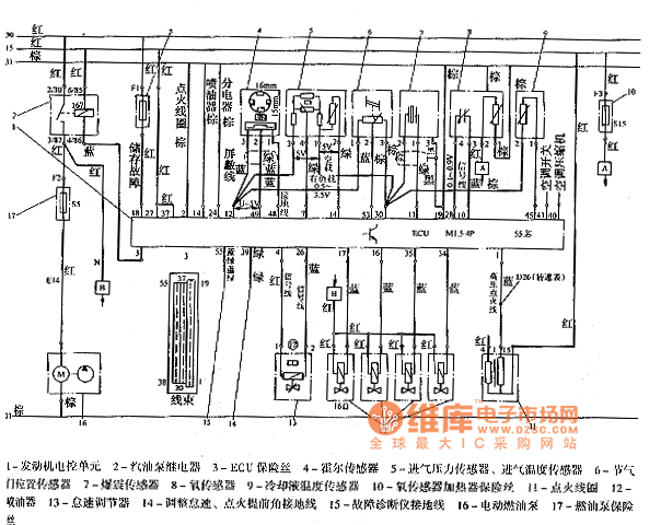 In the picture the part 1 is engine ECU. The part 2 is fuel pump relay. The part 3 is ECU fuse. The part 4 is hall sensor. The part 5 is intake air pressure sensor. The part 6 is throttle position sensor. The part 7 is knock sensor. The part 8 is oxygen sensor. The part 9 is cooling fluid temperature sensor. The part 10 is oxygen sensor heater fuse. The part 11 is ignition coil. The part 12 is injector. The part 13 is idle speed regulator. The part 14 is used to adjust the idle speed, ignition advance angle and then it is connected to the ground. The part 15 is fault diagnosis device and it is connected to ground. The part 16 is electric fuel pump. The part 17 is fuel pump fuse.