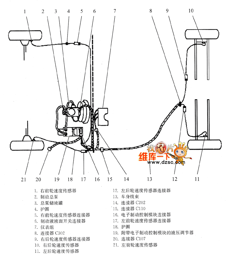 1.right front wheel speed sensor 2.brake master cylinder 3.main pump with reservior 4.flinger 5.right front wheel speed sensor connector 6.brake fluid liquid surface switch connector 7.instrument cluster 8.connector C302 9.right rear wheel speed sensor connector 10.right rear wheel speed sensor 11.left rear wheel speed sensor12.left rear wheel speed sensor connector13.body harness14.connector C20215.connector C11016.Electronic Brake Control Module connector17.left front wheel speed sensor connector18.flinger19.hydraulic regulator with Electronic brake control module20.connector C10721.left front wheel speed sensor
