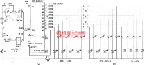 The cable quick detector is mainly used to detect the connection and disconnection states of the computer LAN cable and other similar comprehensive digital network cable and analog cable, which is more convenient and quick than using multimeter. The circuit is divided into two parts---main circuit and remote circuit. Even if the cable's two terminals are not in the same place, it can also detect the circuit. As seen in the figure (a), the main circuit consists of clock generating circuit which is composed of IC1 phase reversal schmitt trigger 74HC14 and LED circuit in proper order which is composed of IC2. The figure (b) shows the remote circuit.