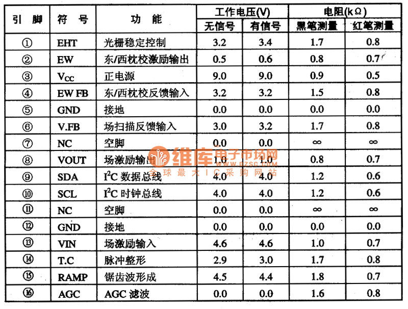 The TA8859CP has the vertical linear compensation and S correction circuit, the parabolic wave circuit, the field scanning sawtooth wave circuit, the trapezoidal distortion correction circuit, the line/field linear adjustment circuit, the line/field center adjustment circuit.etc.