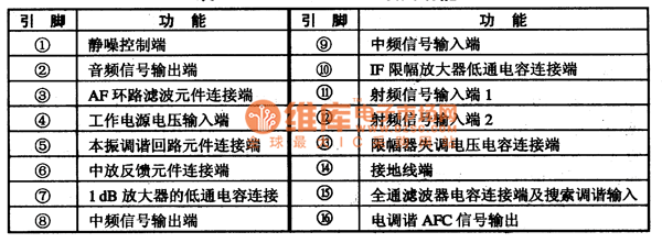 The TDA16846 integrated block internal box circuit is composed of the mixer circuit, the LO circuit, the IF amplifier and limiter circuit. The integrated block internal box circuit and pin functions is as shown in figure 22. This IC is in the dual flat 16-pin mini-SMT package, the pin functionsare as shown in table 36.