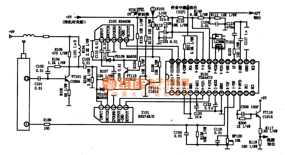The TDA4472 has the SIF signal processing circuit, the SIF's AGC circuit, the VIF's AGC circuit, the RF AGC adjusting control circuit, the video signal processing circuit, the oscillator interface circuit, the AFC voltage generating circuit, the VIF signal processing circuit and the AFC switching circuit.etc. The typical application circuit of the Konka S series large screen color TV is as shown in figure 8.
