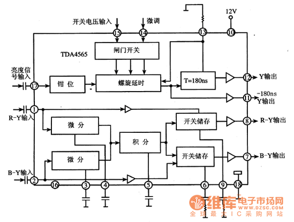 TDA4565 is he brightness delaying integrated circuit produced by Philips, which is widely used in local and imported large screen color TV.1. Function features TDA4565 contains two lines of differentiation and integration handle circuits of chromatism (R-Y) and (B-Y) signals, switch storage circuits, clamp circuits, time delay circuits, throttle valve circuits and so on.
