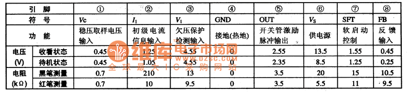 The TDA4605-3 has the sampling voltage processing regulator circuit, the under-voltage detection and protection circuit, the excitation pulse output circuit, the soft-start control circuit.etc. This IC is in the 8-pin package, the pin functions and data is as shown in table 16.