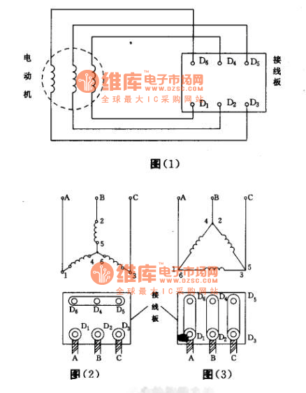 The 3-phase asynchronous motor connection circuit: each of the 3 three stator coils of the motor has 2 outgoing lines. One of them is called the head end, the other is the tail end. The head end is regulated to be represented by D1, the tail end is represented with D4; the second coil head end is represented with D2, the tail end is represented with D5; the head and tail ends of the third coil are represented with D3 and D6 respectively. The 6 outgoing lines are connected with the terminals of the box, and there are the marks of D1~D6 on the wiring terminals.