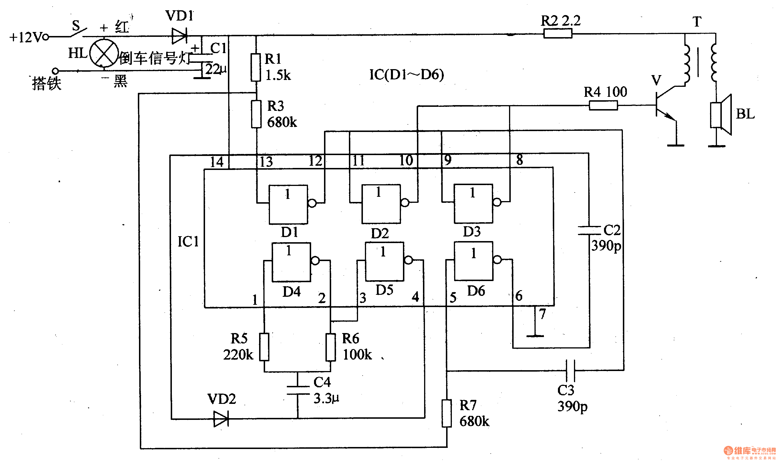 The working principle of the circuitThe car back-up alarm consists of 6 NOR gate integrated circuit IC(Dl-D6), transistor V, output transistor T and loudspeaker BL,etc, see as figure 7-121.