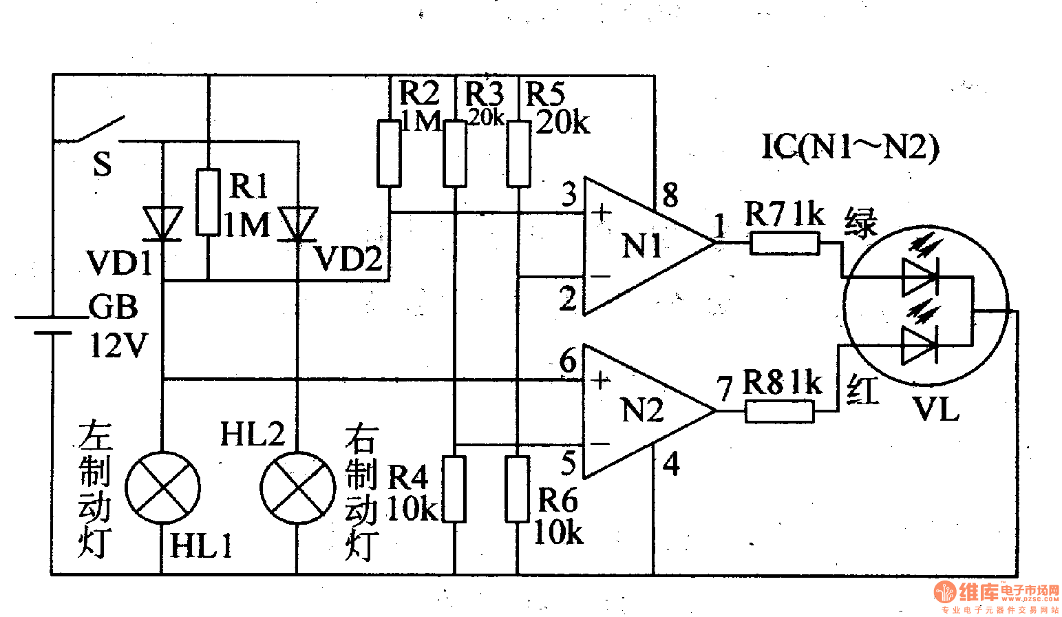 The working principle of the circuitThe car brake lamp fault monitor consists of the dimming LED VL, op-amp integrated circuit IC(N1 and N2) and relevant external elements, see as figure 7-55.