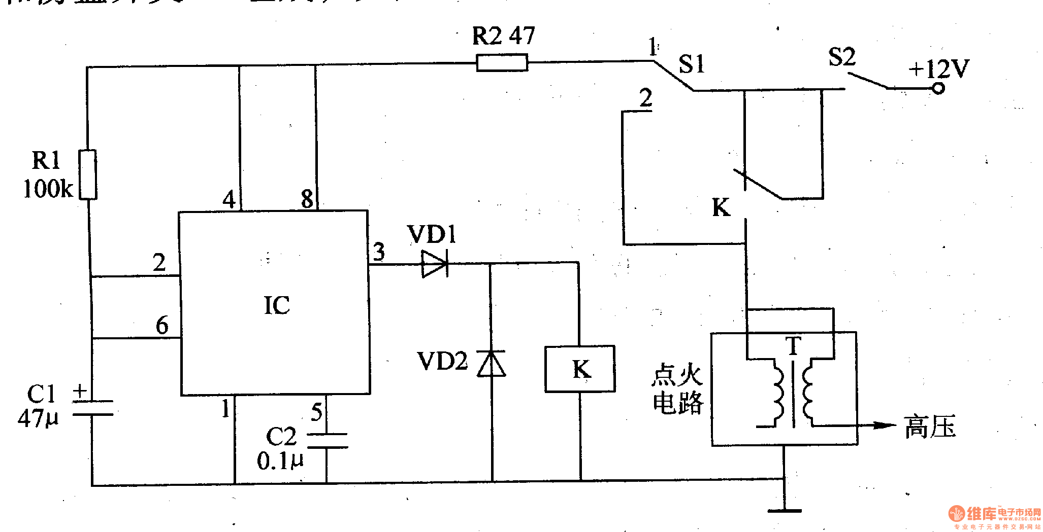 Usually, the driver puts the hidden burglarproof switch at the point of 2 , the single steady time circuit consisting of IC, R1, R2, Cl and C2 does not work, the car can start and run normally.