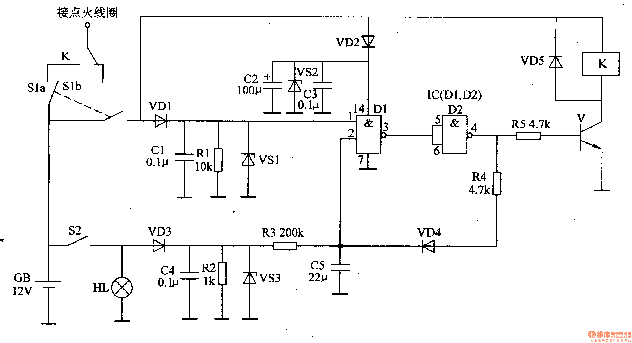 Here is to introduce a car burglarproof alarm which is installed in a hidden place, and it is used to confuse the thief, when the thief is stealing the motor, the motor seems to be ignited but doesn't move, finally, the motor can be ridden away, so the thief have to give up.The working principle of the circuit The car burglarproof alarm circuit consists of resistors R1-R5, capacitors C1-C5, diodes VD1-VD5, regulated diodes VS1-VS3, the transistor V, NAND integrated IC(D1 and D2) and relay K, see as figure 7-69.